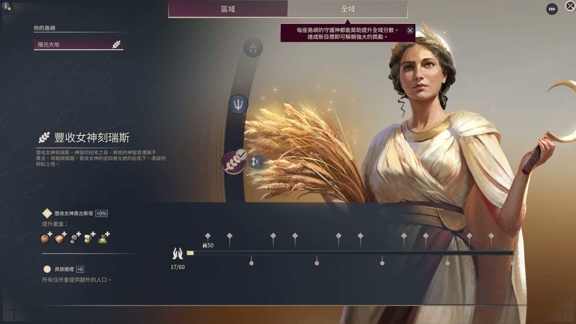 除了研發科技樹的技術外,當玩家佔領一個島嶼時,便可決定島上居民的信仰,而遊戲中設有不同的神祇,衪們所對應的效果也有不同,而且這些效果是需要透過信徒人口來開啟,所以玩家在遊戲中是有幾種不同的方法,可使用針對某一個神祇,例如豐收女神等來集中提升,或是根據某些島嶼的特性,例如商業都市就信仰商業之神來令效果增加,這個完全取決於玩家在營運方式上的選擇。