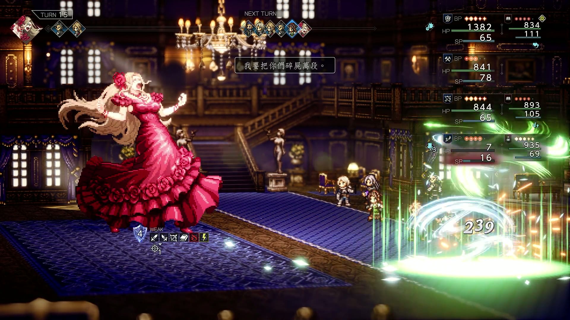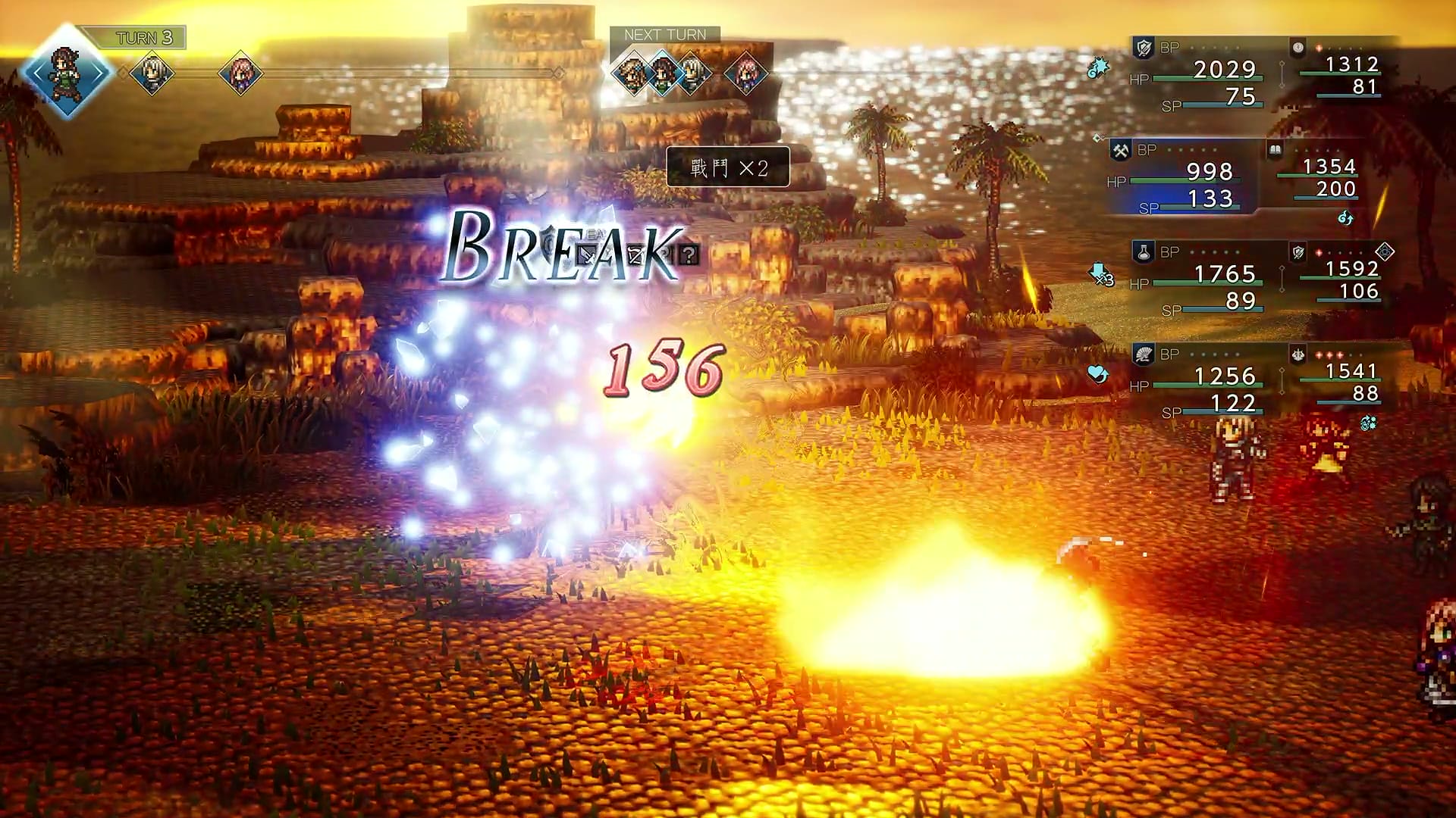 戰鬥系統向來是《歧路旅人》系列中的核心所在,本作更是將戰略玩法再深化一些,遊戲延續前作設計,每位敵人都有其獨特弱點,玩家需在戰鬥中利用攻擊或技能來找出來,這種形式的戰鬥大幅提升了對戰的趣味性,而在戰鬥的角色上,由於遊戲中的同伴真的太多,所以亦轉變成八位角色分前後排上陣,玩家每回合可操作四位角色,玩家需要在各個不同的技能之間取得一個平衡,例如主要的攻擊角色,或是輔助及回復角色等,組成一個適