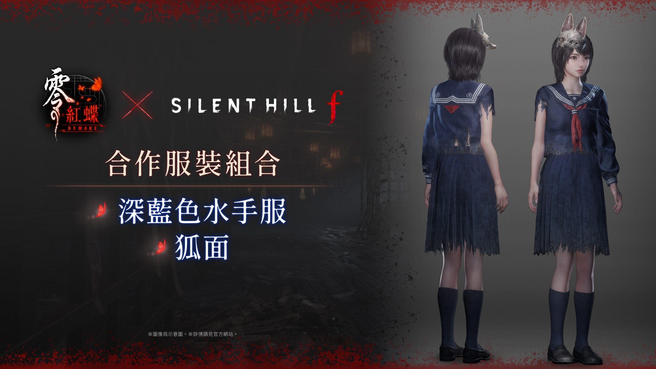 在本次推出的《零 ~紅蝶~ REMAKE》×《SILENT HILL f》合作服裝組合中,收錄《SILENT HILL f》主角深水雛子所穿著的「深藍色水手服」與「狐面」。服裝「深藍色水手服」可供天倉澪穿著,飾品「狐面」則可供天倉澪與天倉繭使用。透過更換服裝,能重現雛子那帶有一絲詭異而唯美的姿態,讓您在《零 ~紅蝶~ REMAKE》中體驗《SILENT HILL f》的世界。