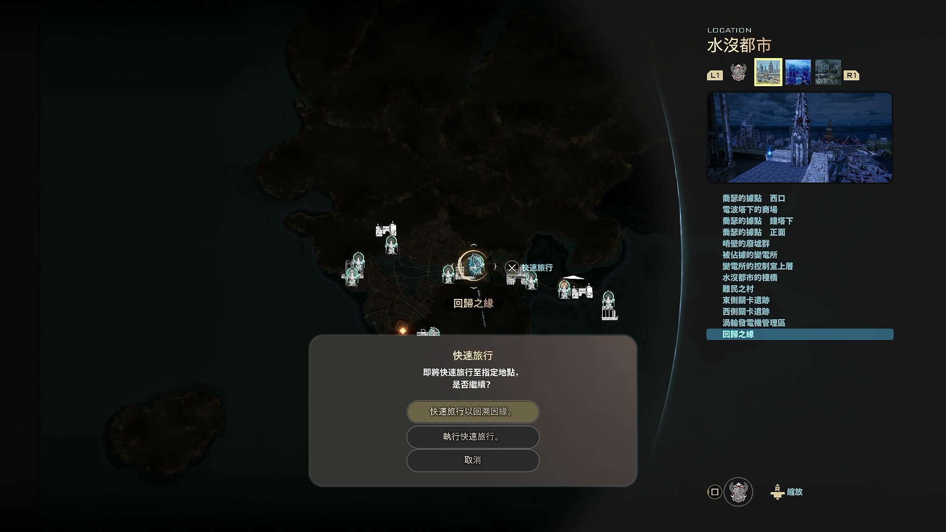 由於本作的地圖實在太大的關係,所以玩家是可以利用「槲寄生」的位置來進行休息及快速移動,而遊戲中亦設有「快速旅行」的功能,玩家可在地圖或列表中進行選擇,同時由於遊戲中是設有不同的時間節點,所以遊戲亦特別設有「快速旅行以回溯因緣」的功能,讓玩家能立即回到想去的時代,這個功能亦免卻了很多讀取時間。