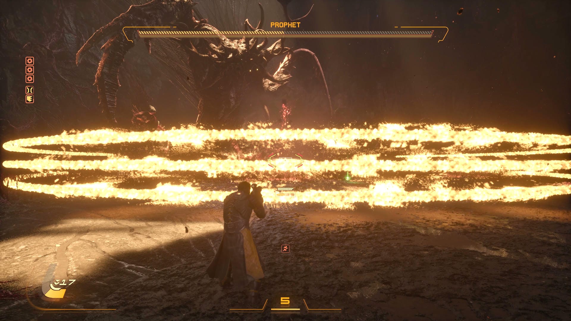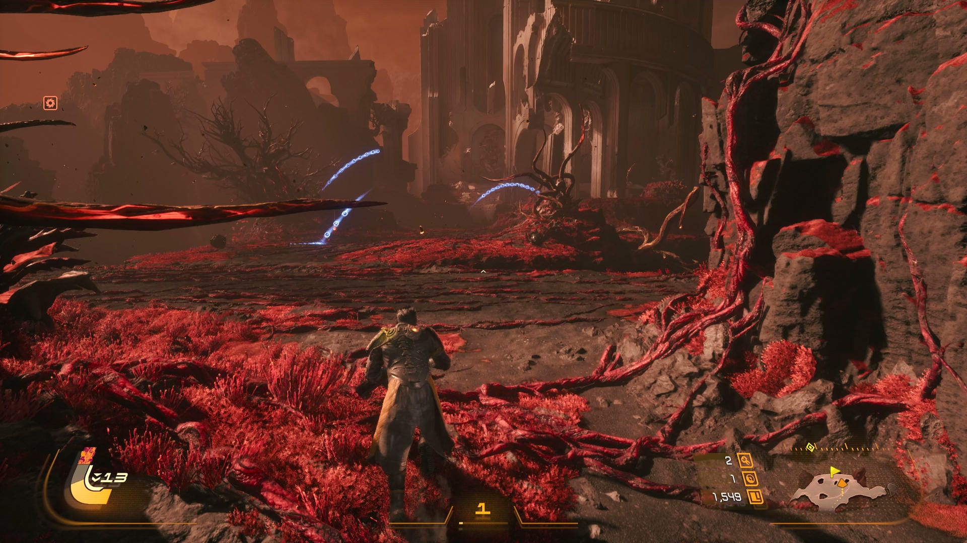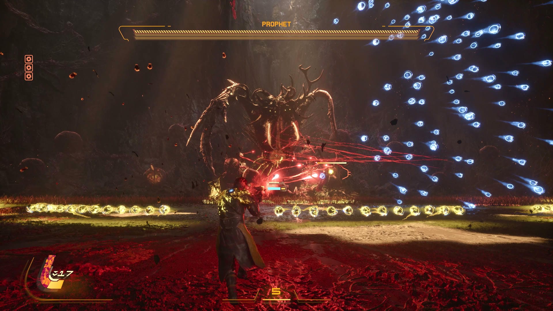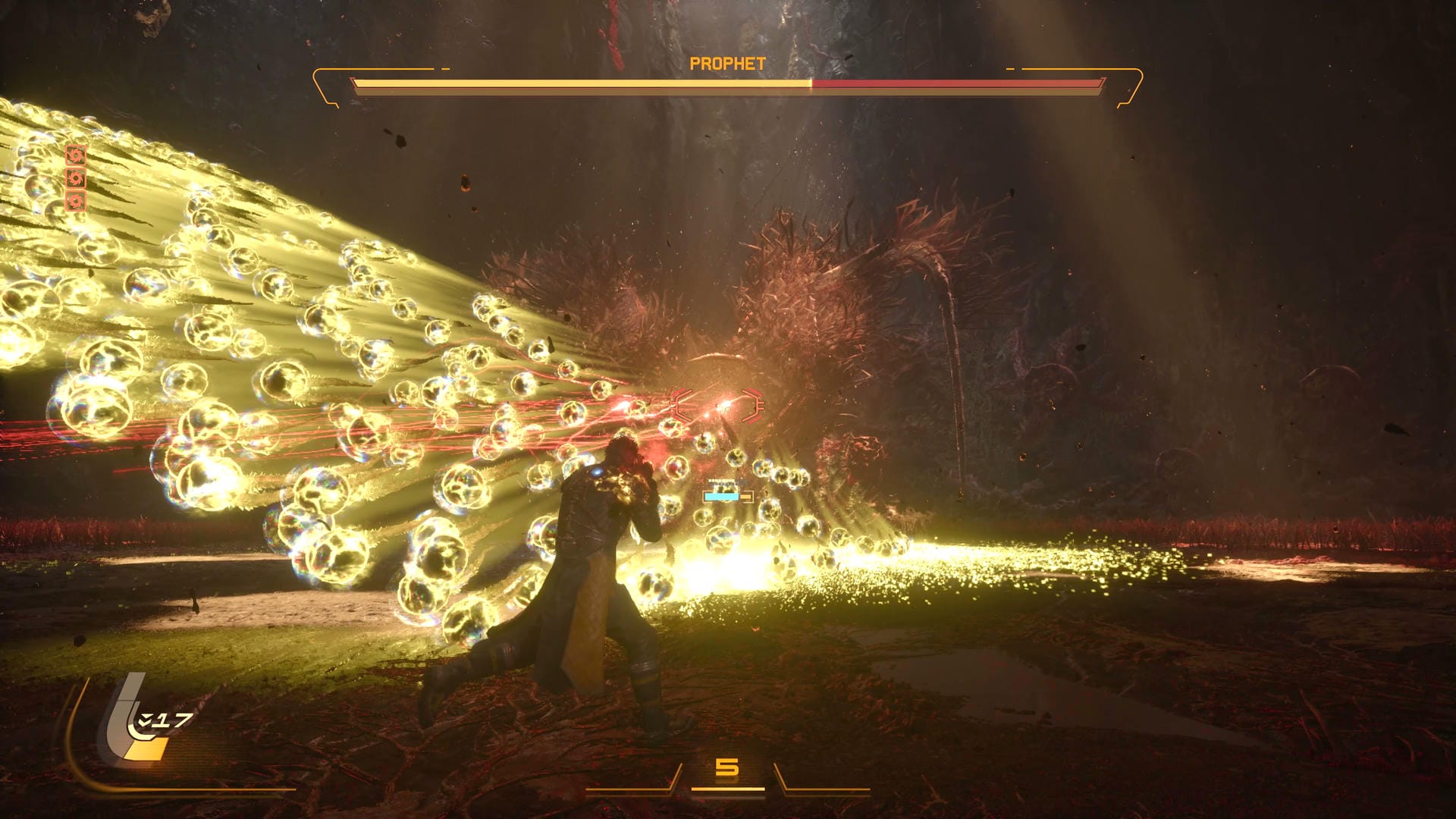 在玩法上,其實本作與之前的《Returnal》大致相近,但過去的只是迴避彈幕,面對鋪天蓋地的攻勢時,玩家能做的只是迴避,但來到《Saros》時卻發生了很大的變化,當玩家看到藍色的彈幕時,這不單止是攻擊,而是可收集的資源,玩家只要使用護盾便可將之吸收,但要留意的是使用護盾時,要消耗掉藍色彈幕的能量,這樣一來一回,便構成了一個防禦與收集的循環機制。