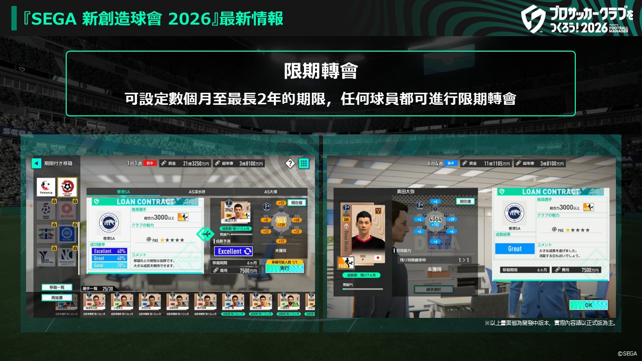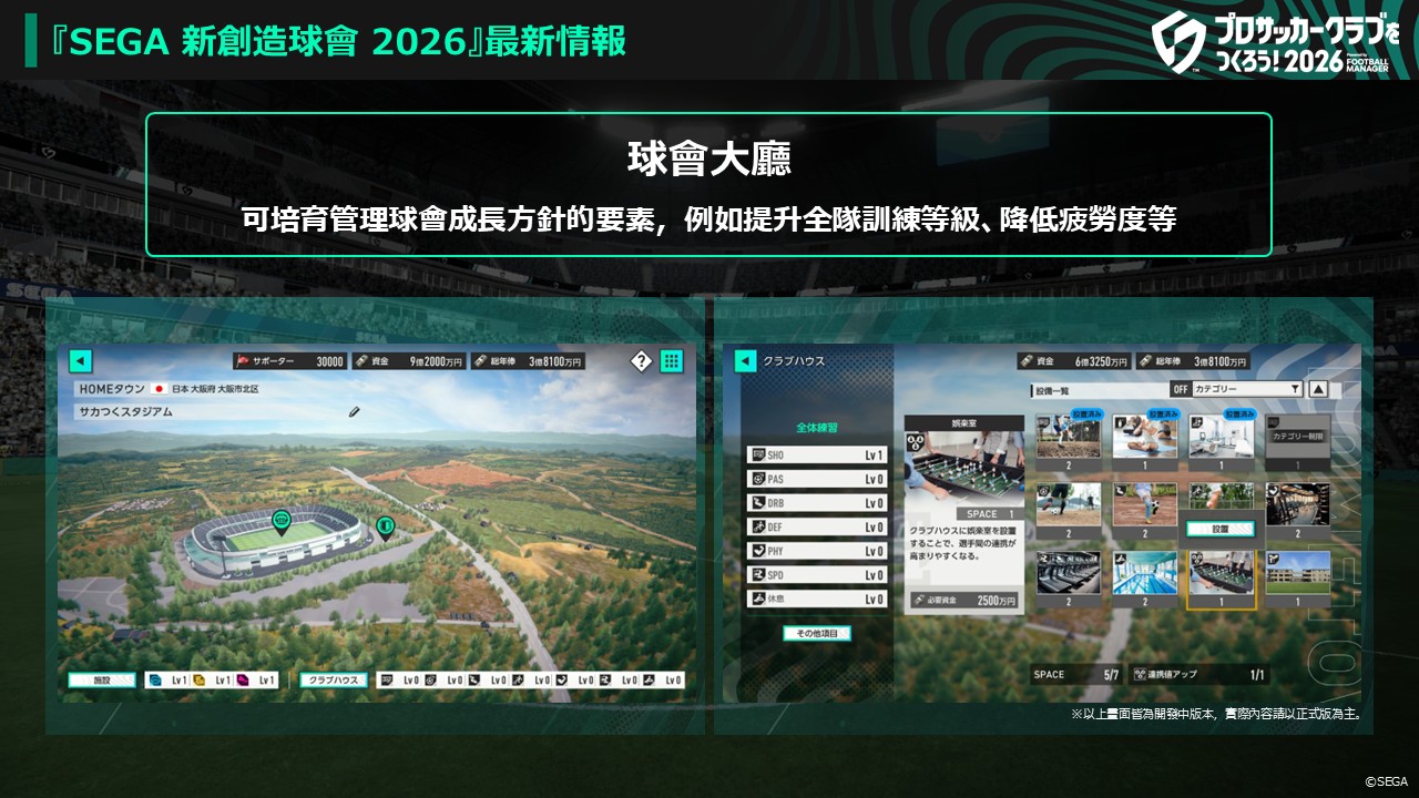 在《創造球會TV#02》直播中,除了公布2026年1月22日正式上線,官方也揭露多項新系統與便利性優化,讓球會經營更具策略性與流暢度。例如眾多監督非常期待的「限期轉會」系統,而「球會大廳」則提供培育成長要素的功能,透過提升全隊訓練等級、降低疲勞度,全面強化球隊競爭力。