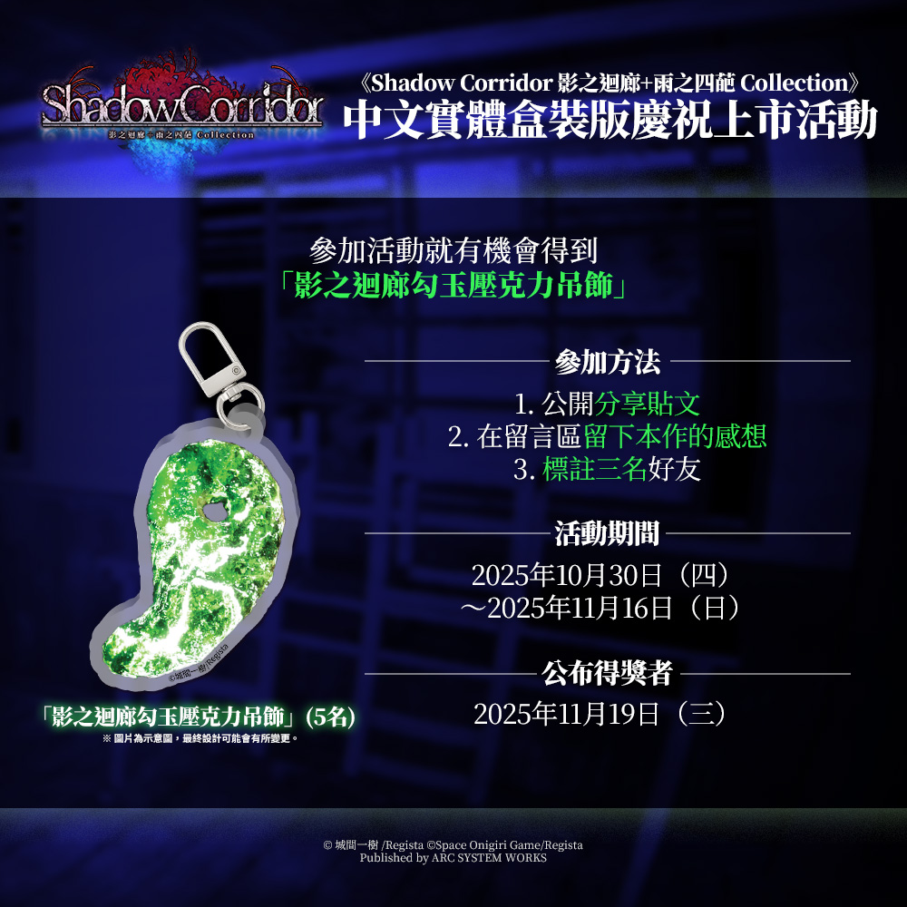 為慶祝《Shadow Corridor 影之迴廊+雨之四葩 Collection》中文實體盒裝版上市,從今天起舉辦抽獎活動。公開分享活動貼文並在留言區留下關於本作的感想,就有機會得到「影之迴廊勾玉壓克力吊飾」。抽獎活動詳情如下。