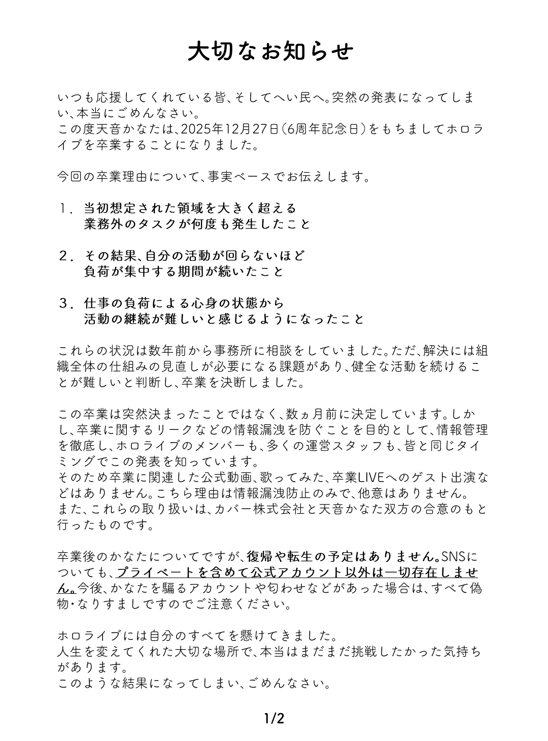 【天音かなた卒業に関するお知らせ】 pic.twitter.com/0RVLHZFWSG