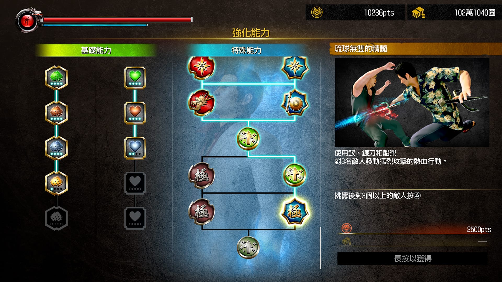 「琉球風格」具備多種結合沖繩武器的技此外,部分熱血動作可順暢地銜接在一般的連擊動作後發動。在連擊途中使出強大的熱血動作,給敵人致命一擊吧!術性「熱血動作」。