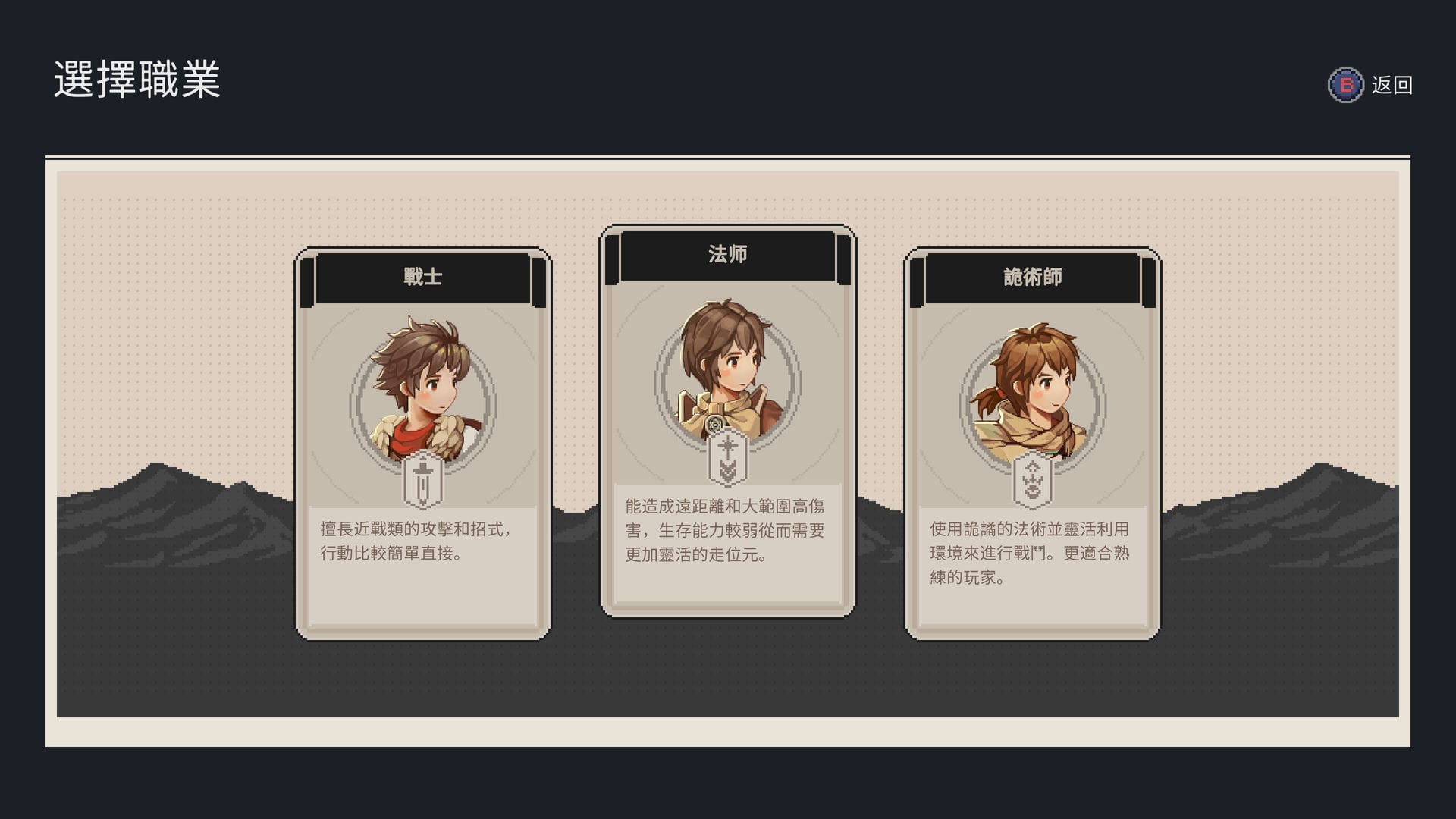 本作擁有各式各樣的職業供你遊玩:戰士,法師,與詭術師。有些職業甚至有分支,其玩法更是不同。比如有的靠疊層增加傷害,有的需要先充能才可以進行攻擊跟防禦,有的需要把地形環境與陷阱轉化為自己的武器。保證每一場冒險都不會單一,不同的職業會給予你嶄新的遊戲體驗!