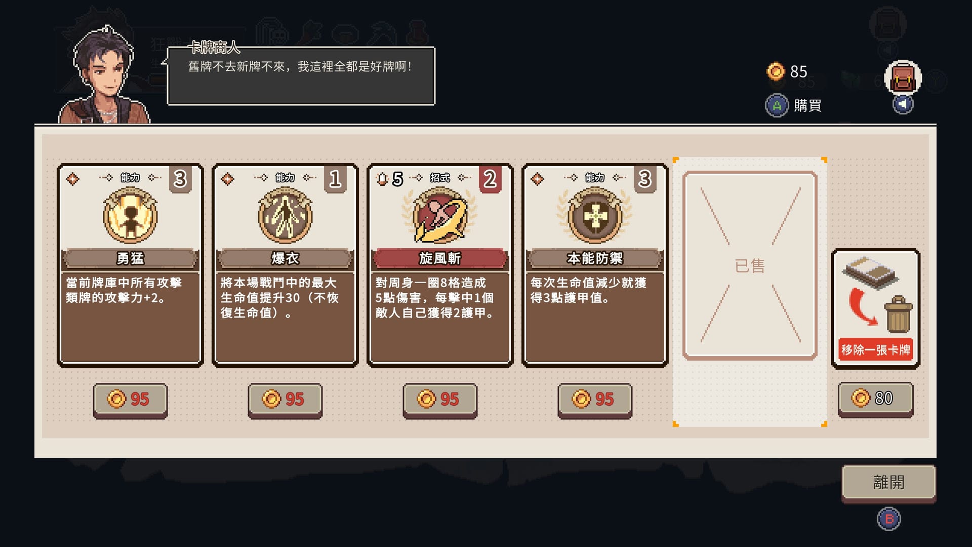 在冒險途中,你也會遇到各種能幫助你的NPC們。有的能給你一次免費提升卡牌的能力,有的會販賣有用的道具與卡牌。但是要注意,商人等NPC會在你沒有購買物品的情況下離開後會漲價!如果想購買道具或者秘寶的話,最好在存好資金後再去拜訪商店。