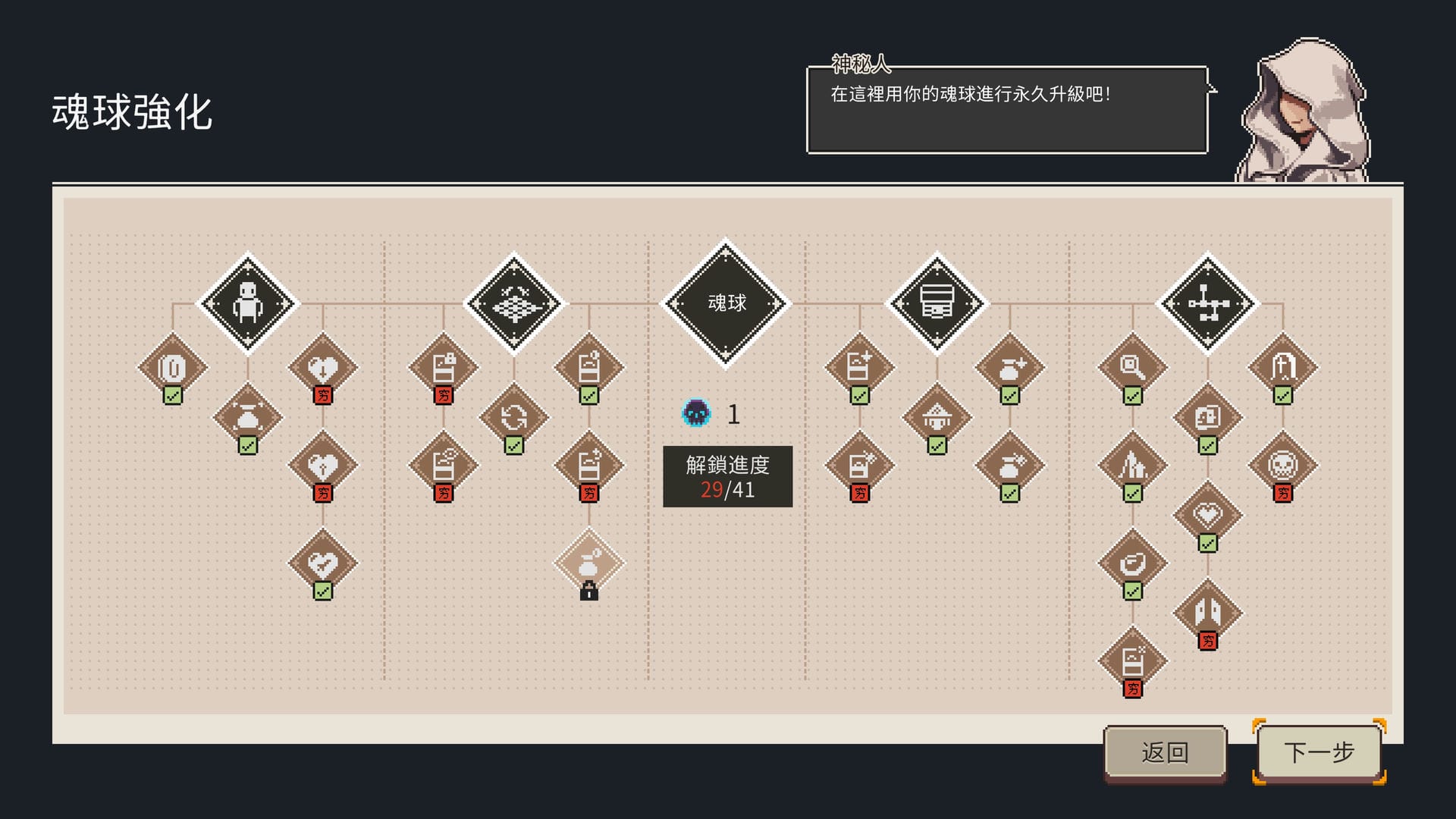 即使絞盡腦汁,當運氣不好的時候,還是會逃不過戰敗的命運。面對失敗或許會很沮喪,但每一次冒險後都會獲得一定數量的魂球。魂球可以在下一場冒險前進行各種升級,除了提升各職業的體力上限外,還能在遊戲中添加利於你的選項,比如提升在篝火休息時的HP恢復量等,於此提高勝利的機會!
